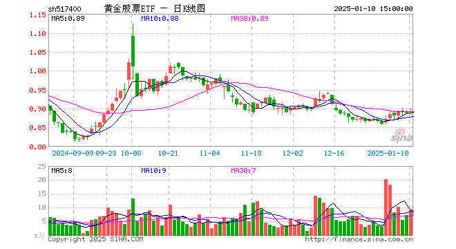 1月10日,黄金股票ETF(517400)涨0.34%,成交额831.38万元。当日份额增加2300.00万份,最新份额为8479.20万份,近20个交易日份额增加2500.00万份。最新资产净值计算值为7543.10万元。