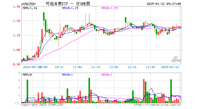1月22日,可选消费ETF(562580)开盘跌0.78%,报1.151元。可选消费ETF(562580)重仓股方面,美的集团开盘跌0.03%,比亚迪跌0.37%,格力电器跌0.22%,海尔智家跌0.15%,福耀玻璃涨0.02%,中国中免跌0.50%,长安汽车跌0.47%,赛力斯跌2.81%,上汽集团跌1.42%,三花智控跌1.25%。