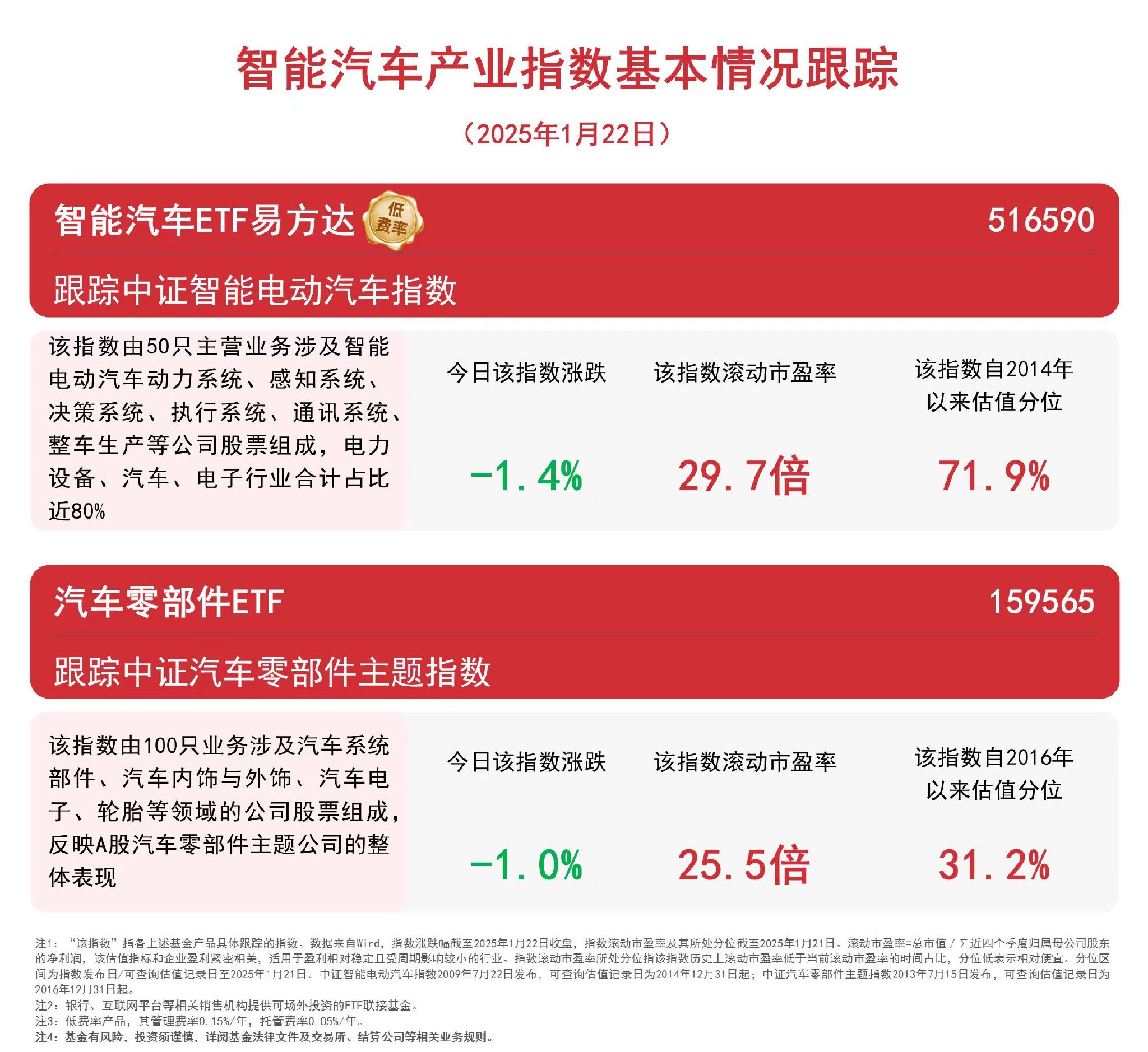 截至收盘,中证智能电动汽车指数下跌1.4%,中证汽车零部件主题指数下跌1.0%。