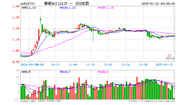 1月23日,摩根MSCIAETF(515770)开盘涨0.80%,报1.137元。摩根MSCIAETF(515770)重仓股方面,贵州茅台开盘涨0.62%,宁德时代涨0.72%,招商银行涨0.56%,长江电力涨0.10%,中国平安涨1.78%,五粮液涨0.96%,比亚迪涨0.88%,农业银行涨0.20%,工商银行涨0.62%,东方财富涨3.08%。