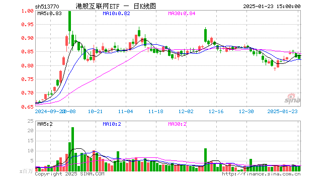 1月23日,港股互联网ETF(513770)跌0.60%,成交额2.23亿元。当日份额减少100.00万份,最新份额为34.83亿份,近20个交易日份额减少2.27亿份。最新资产净值计算值为28.69亿元。
