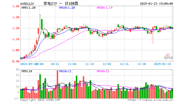 1月23日,家电ETF(561120)跌0.08%,成交额1661.13万元。当日份额减少150.00万份,最新份额为9865.99万份,近20个交易日份额减少1050.00万份。最新资产净值计算值为1.18亿元。