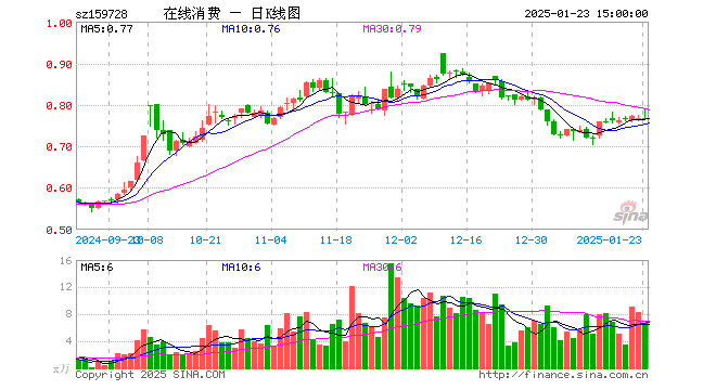 1月23日,在线消费ETF(159728)涨0.00%,成交额524.76万元。当日份额增加50.00万份,最新份额为8341.01万份,近20个交易日份额减少150.00万份。最新资产净值计算值为6395.05万元。