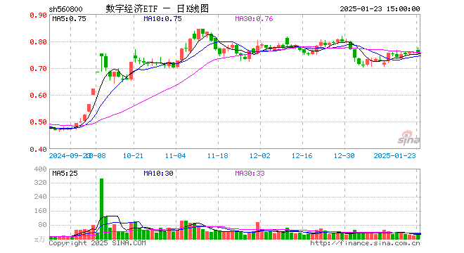 1月23日,数字经济ETF(560800)跌0.66%,成交额2095.57万元。当日份额减少1000.00万份,最新份额为11.08亿份,近20个交易日份额减少5400.00万份。最新资产净值计算值为8.32亿元。