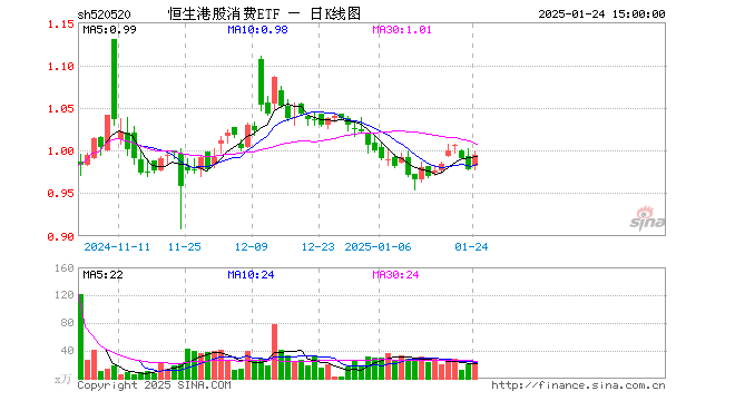 1月24日,恒生港股消费ETF(520520)涨1.74%,成交额2415.94万元。当日份额减少300.00万份,最新份额为6960.60万份,近20个交易日份额增加300.00万份。最新资产净值计算值为6895.87万元。