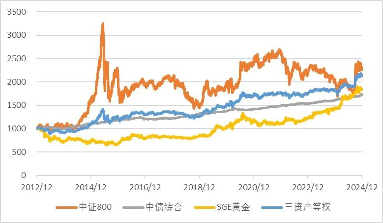 以国内市场为例,我们用中证800指数、中债综合指数和上金所SGE黄金来分别指代股票、债券、黄金三类资产,构造一个“三资产等权组合”。