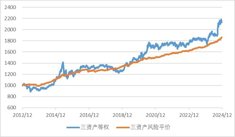我们同样以股、债、黄金构建的“三资产组合”为例,测算其资金等权组合和风险平价组合在2013~2024年期间的历史表现,可以看出:在等风险贡献模型下,风险平价组合的整体表现明显比等权组合更为平滑。