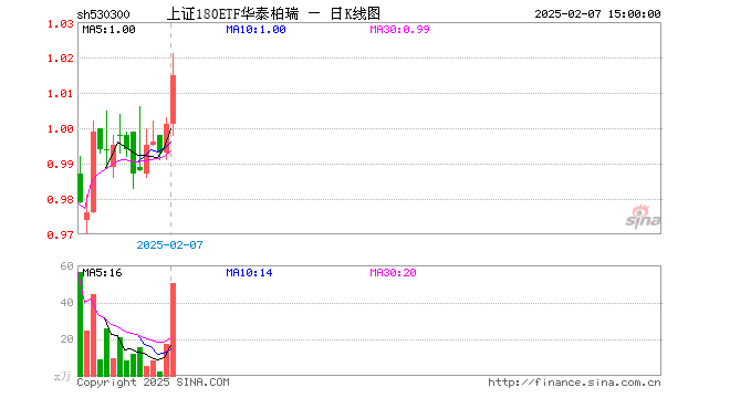 2月7日,上证180ETF华泰柏瑞(530300)涨1.40%,成交额5117.54万元。当日份额减少3200.00万份,最新份额为1.46亿份。最新资产净值计算值为1.48亿元。