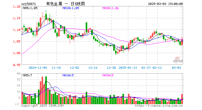 3月3日,有色金属ETF(159871)涨2.42%,成交额1349.86万元。当日份额减少150.00万份,最新份额为1.03亿份,近20个交易日份额减少700.00万份。最新资产净值计算值为1.09亿元。