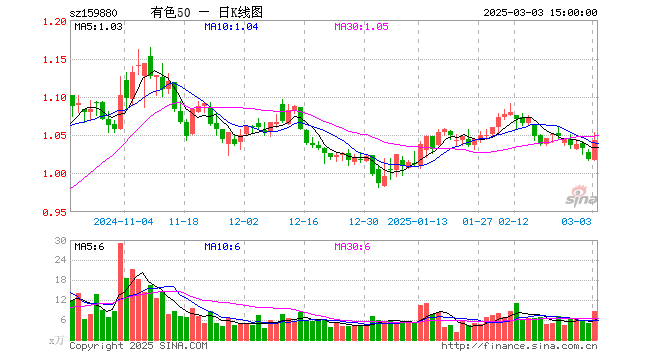 3月3日,有色ETF基金(159880)涨2.46%,成交额915.63万元。当日份额减少200.00万份,最新份额为1.00亿份,近20个交易日份额减少850.00万份。最新资产净值计算值为1.04亿元。