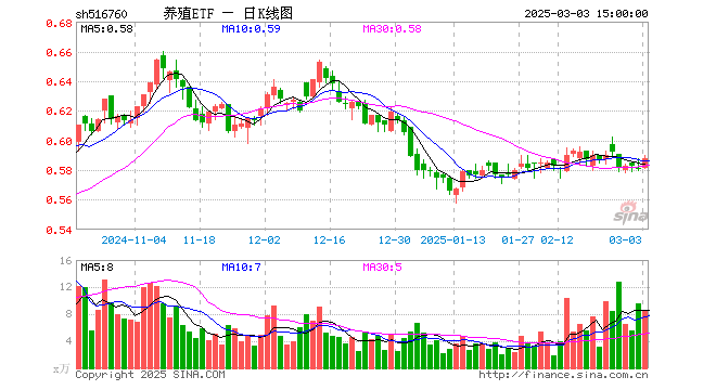 3月3日,养殖ETF(516760)涨1.20%,成交额510.84万元。当日份额减少500.00万份,最新份额为2.45亿份,近20个交易日份额增加500.00万份。最新资产净值计算值为1.44亿元。