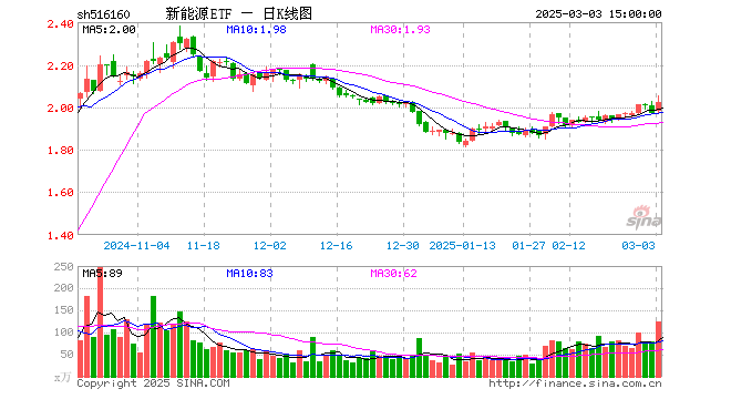 3月3日,新能源ETF(516160)涨2.54%,成交额2.50亿元。当日份额减少2000.00万份,最新份额为24.44亿份,近20个交易日份额增加5950.00万份。最新资产净值计算值为49.28亿元。