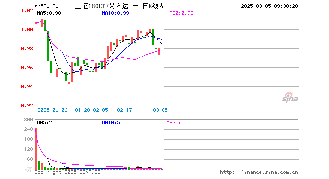 3月5日,上证180ETF易方达(530180)开盘涨0.00%,报0.980元。上证180ETF易方达(530180)重仓股方面,贵州茅台开盘涨0.13%,中国平安涨0.20%,招商银行涨0.38%,恒瑞医药涨0.00%,紫金矿业涨0.00%,长江电力跌0.04%,京沪高铁涨0.00%,中芯国际涨0.02%,药明康德涨0.79%,中信证券涨0.00%。