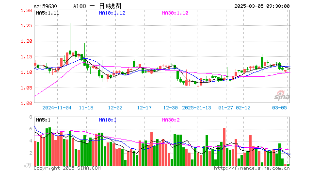 3月5日,A100ETF基金(159630)开盘涨0.18%,报1.107元。A100ETF基金(159630)重仓股方面,贵州茅台开盘涨0.13%,宁德时代涨0.00%,中国平安涨0.20%,招商银行涨0.38%,美的集团跌0.10%,长江电力跌0.04%,中信证券涨0.00%,兴业银行涨0.05%,紫金矿业涨0.00%,比亚迪涨0.63%。