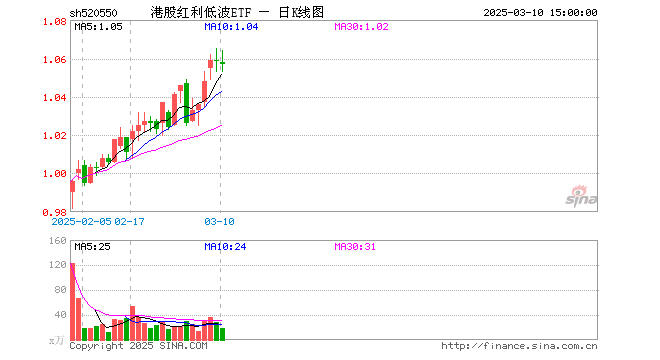 港股红利低波ETF(520550)业绩比较基准为恒生港股通高股息低波动指数收益率(经汇率调整后),管理人为招商基金管理有限公司,基金经理为许荣漫,成立(2025-01-15)以来回报为4.50%,近一个月回报为5.13%。