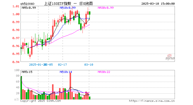 3月10日,上证180ETF指数(510040)跌0.40%,成交额897.12万元。当日份额减少1000.00万份,最新份额为2.42亿份,近20个交易日份额减少2.32亿份。最新资产净值计算值为2.43亿元。