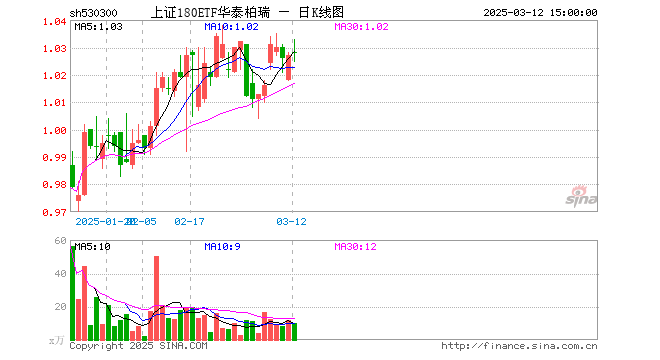 3月12日,上证180ETF华泰柏瑞(530300)涨0.10%,成交额1047.55万元。当日份额减少400.00万份,最新份额为2.68亿份,近20个交易日份额增加1.38亿份。最新资产净值计算值为2.75亿元。