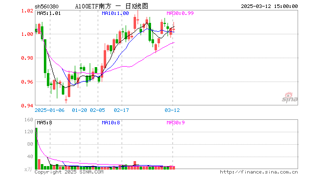 A100ETF南方(560380)业绩比较基准为中证A100指数收益率,管理人为南方基金管理股份有限公司,基金经理为龚涛,成立(2024-12-19)以来回报为0.32%,近一个月回报为0.67%。
