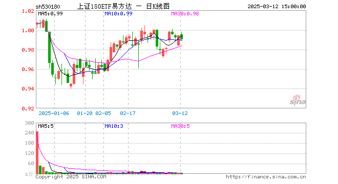 3月12日,上证180ETF易方达(530180)跌0.40%,成交额239.63万元。当日份额减少200.00万份,最新份额为2.34亿份,近20个交易日份额增加6400.00万份。最新资产净值计算值为2.32亿元。