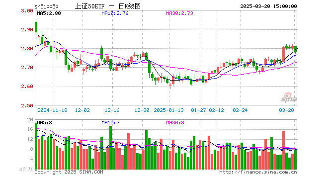 3月20日,上证50ETF(510050)跌1.07%,成交额21.57亿元。当日份额增加1.16亿份,最新份额为533.17亿份,近20个交易日份额减少8.05亿份。最新资产净值计算值为1481.35亿元。