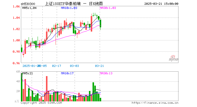 3月21日,上证180ETF华泰柏瑞(530300)跌1.35%,成交额657.65万元。当日份额减少200.00万份,最新份额为1.84亿份,近20个交易日份额增加1800.00万份。最新资产净值计算值为1.88亿元。