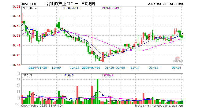 3月24日,创新药产业ETF(516060)跌0.40%,成交额208.36万元。当日份额减少100.00万份,最新份额为2.38亿份,近20个交易日份额减少500.00万份。最新资产净值计算值为1.18亿元。