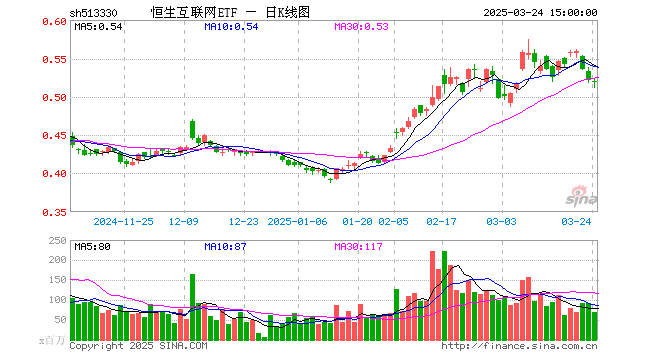 3月24日,恒生互联网ETF(513330)跌0.38%,成交额35.39亿元。当日份额增加2.88亿份,最新份额为449.33亿份,近20个交易日份额减少10.68亿份。最新资产净值计算值为233.52亿元。