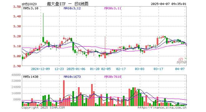 4月7日,超大盘ETF(510020)开盘跌4.71%,报2.977元。超大盘ETF(510020)重仓股方面,海光信息开盘跌4.56%,工商银行跌1.31%,农业银行跌1.15%,中国石油跌7.37%,伊利股份跌2.76%,招商银行跌4.01%,长江电力跌1.27%,兴业银行跌4.15%,中国神华跌2.41%,中国船舶跌4.45%。