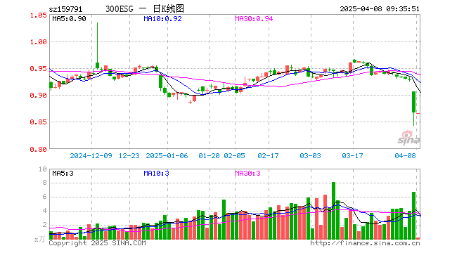 4月8日,300ESGETF(159791)开盘跌0.35%,报0.864元。300ESGETF(159791)重仓股方面,贵州茅台开盘涨0.87%,宁德时代涨2.20%,招商银行跌0.12%,长江电力跌0.25%,美的集团涨1.22%,中信证券涨0.37%,比亚迪涨0.00%,五粮液涨0.00%,工商银行跌0.89%,兴业银行涨0.00%。