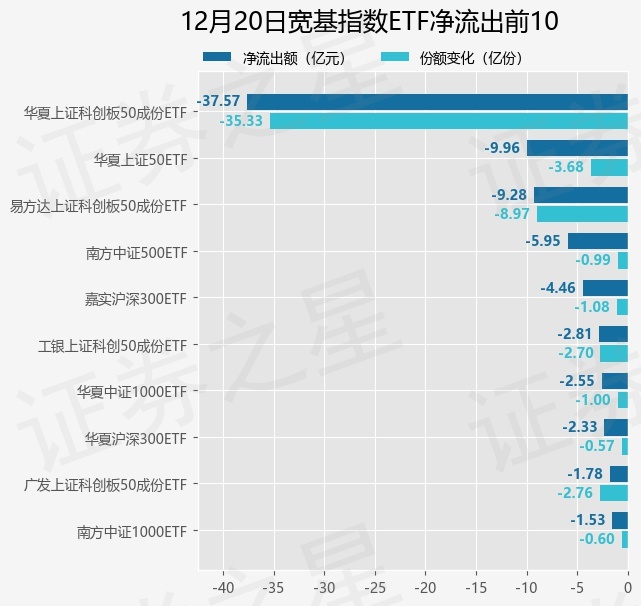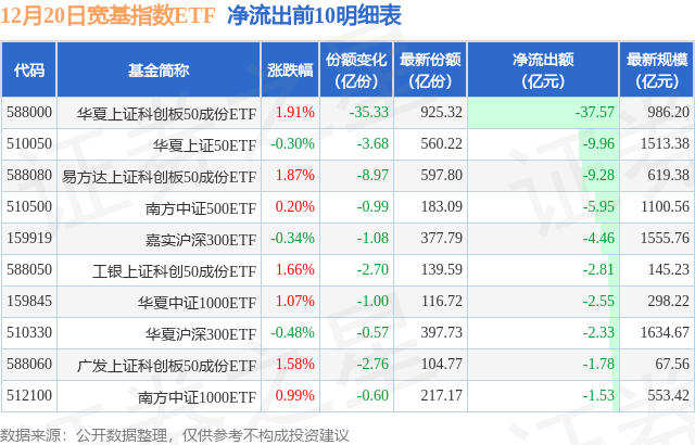 当日有76只宽基指数ETF基金出现资金净流出,其中净流出排首位的是华夏上证科创板50成份ETF(588000),份额减少了35.33亿份,净流出额为37.57亿元。