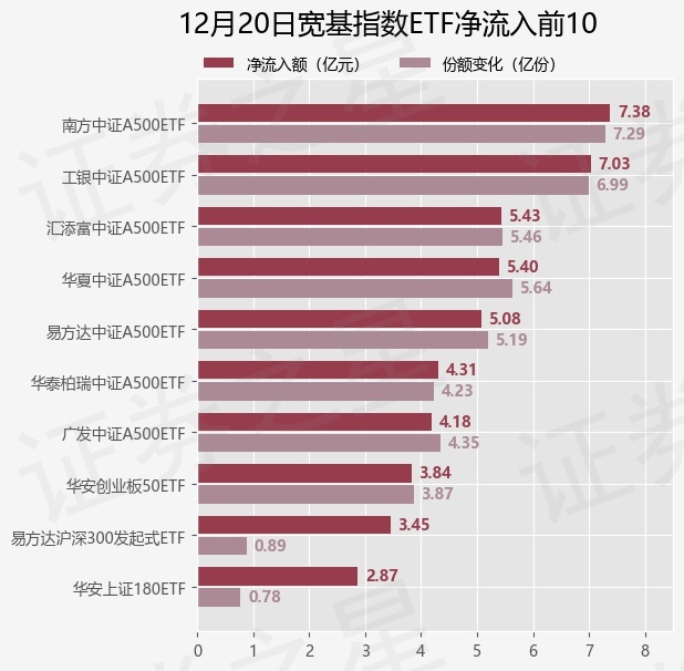 证券之星消息,12月20日宽基指数ETF基金合计资金净流出27.87亿元,近5个交易日累计净流出3.25亿元,5个交易日中出现日合计资金净流出的有3天(ETF资金流向计算公式:(当日ETF场内流通份额-前一交易日ETF场内流通份额)*当日ETF均价,计算结果仅供参考)。