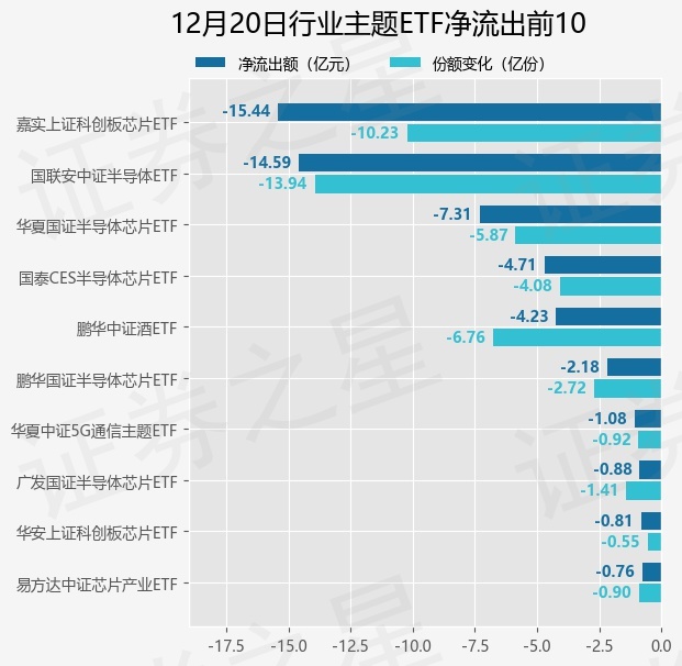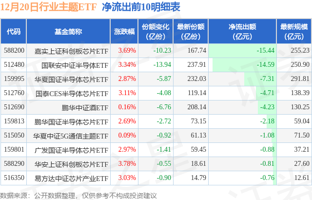 当日有126只行业主题ETF基金出现资金净流出,其中净流出排首位的是嘉实上证科创板芯片ETF(588200),份额减少了10.23亿份,净流出额为15.44亿元。