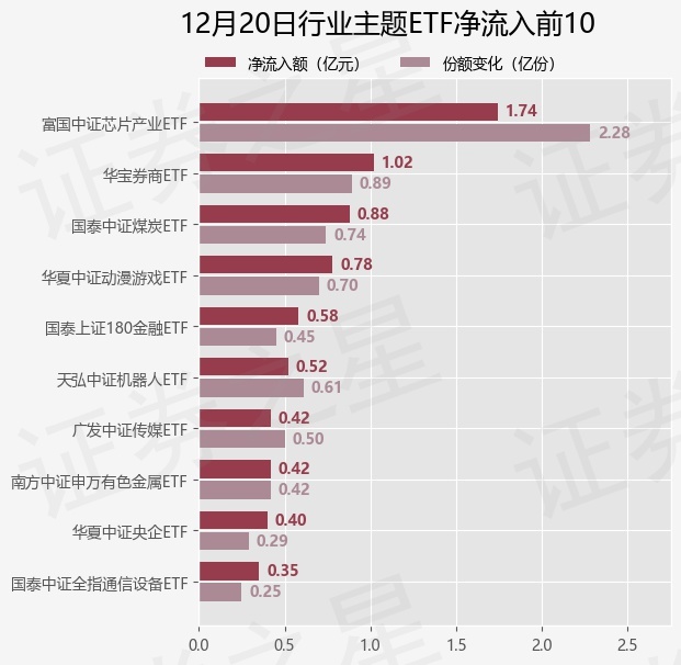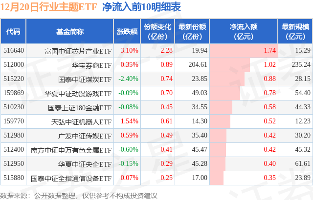 当日有113只行业主题ETF基金出现资金净流入,其中净流入排首位的是富国中证芯片产业ETF(516640),份额增加了2.28亿份,净流入额为1.74亿元。