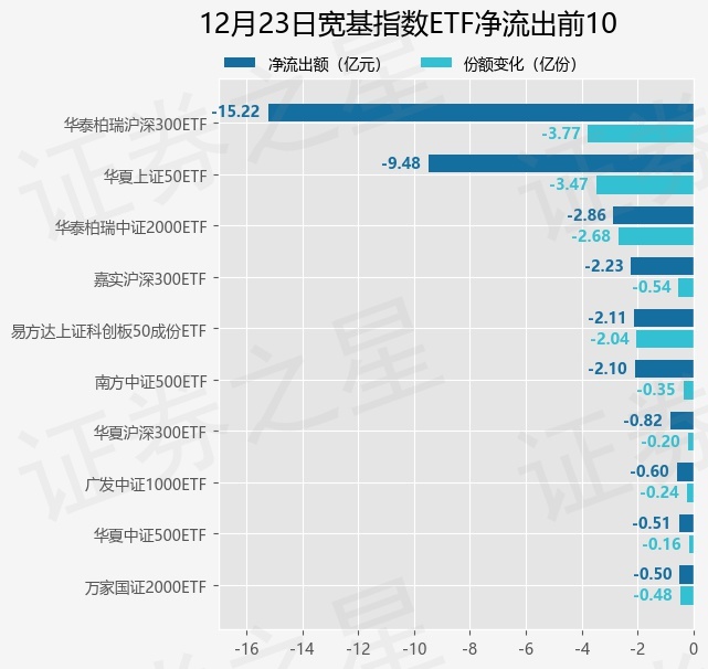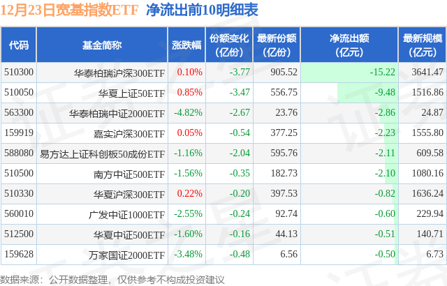 当日有78只宽基指数ETF基金出现资金净流出,其中净流出排首位的是华泰柏瑞沪深300ETF(510300),份额减少了3.77亿份,净流出额为15.22亿元。