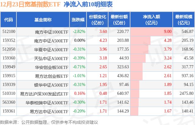 当日有65只宽基指数ETF基金出现资金净流入,其中净流入排首位的是南方中证1000ETF(512100),份额增加了3.6亿份,净流入额为9.0亿元。