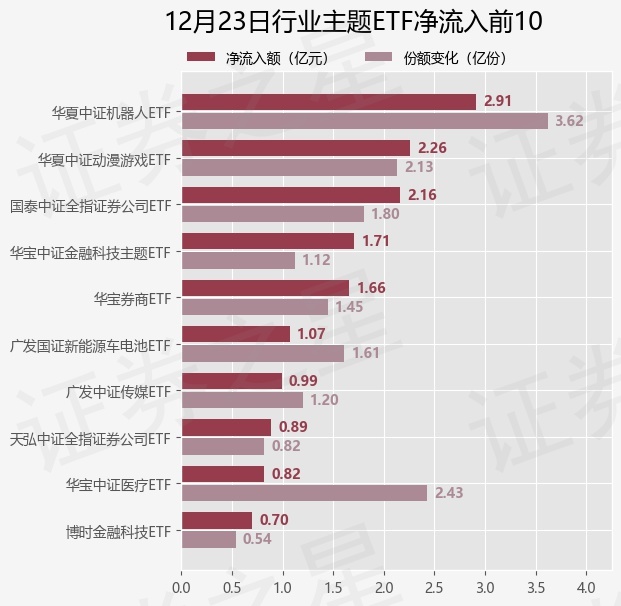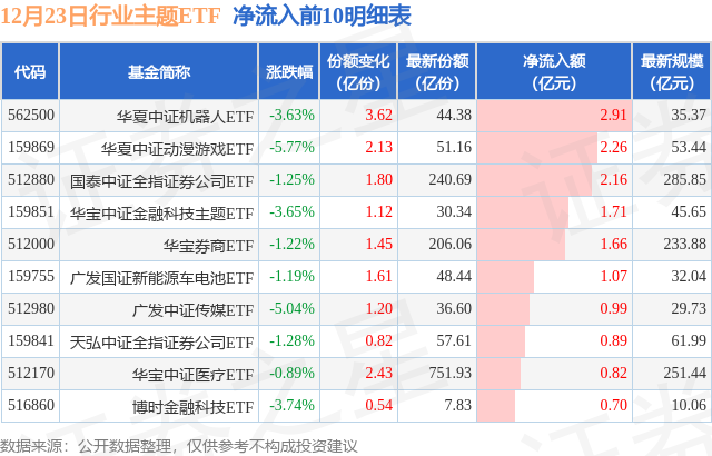 当日有148只行业主题ETF基金出现资金净流入,其中净流入排首位的是华夏中证机器人ETF(562500),份额增加了3.62亿份,净流入额为2.91亿元。