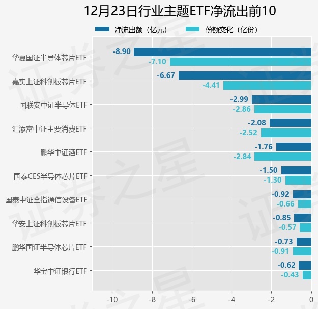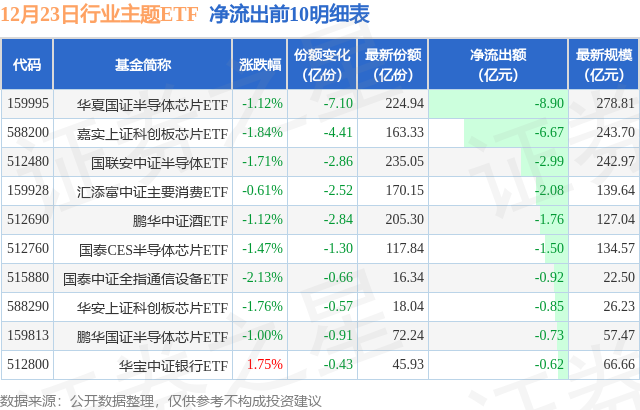 当日有131只行业主题ETF基金出现资金净流出,其中净流出排首位的是华夏国证半导体芯片ETF(159995),份额减少了7.1亿份,净流出额为8.9亿元。