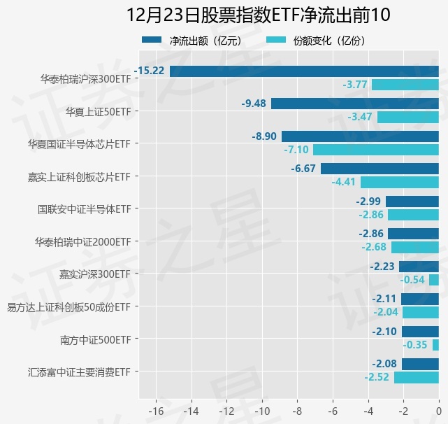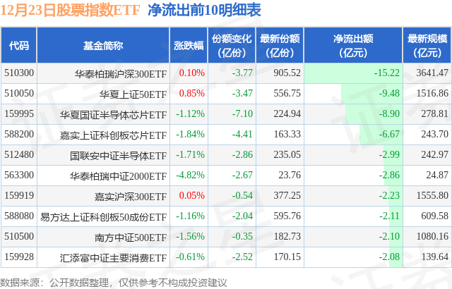 当日有242只股票指数ETF基金出现资金净流出,其中净流出排首位的是华泰柏瑞沪深300ETF(510300),份额减少了3.77亿份,净流出额为15.22亿元。