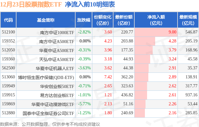 当日有297只股票指数ETF基金出现资金净流入,其中净流入排首位的是南方中证1000ETF(512100),份额增加了3.6亿份,净流入额为9.0亿元。