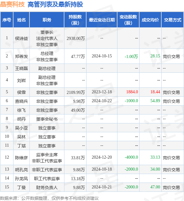 晶赛科技的高管列表及最新持股情况如下: