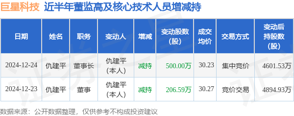 巨星科技近半年内的董监高及核心技术人员增减持详情如下: