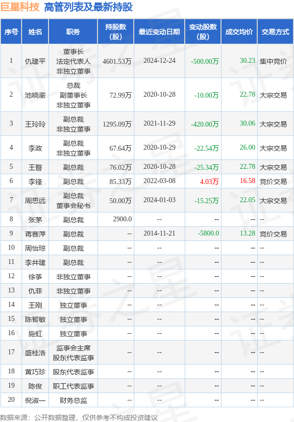 巨星科技的高管列表及最新持股情况如下: