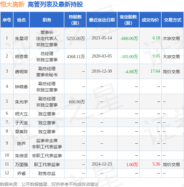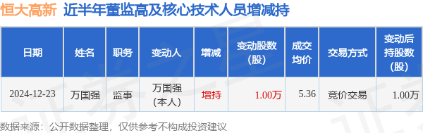恒大高新近半年内的董监高及核心技术人员增减持详情如下: