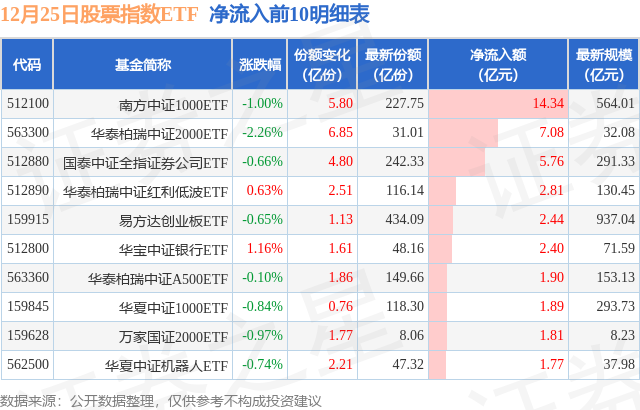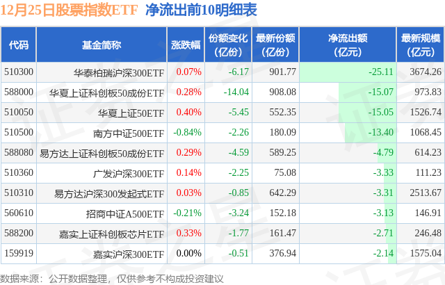 当日有207只股票指数ETF基金出现资金净流出,其中净流出排首位的是华泰柏瑞沪深300ETF(510300),份额减少了6.17亿份,净流出额为25.11亿元。