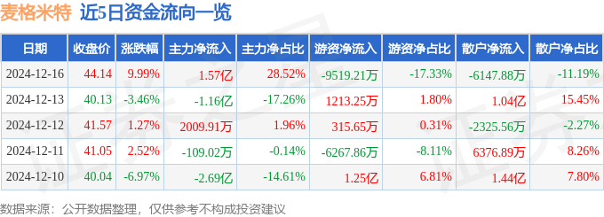 12月16日的资金流向数据方面,主力资金净流入1.57亿元,占总成交额28.52%,游资资金净流出9519.21万元,占总成交额17.33%,散户资金净流出6147.88万元,占总成交额11.19%。