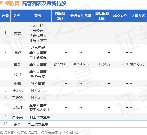 科德教育的高管列表及最新持股情况如下: