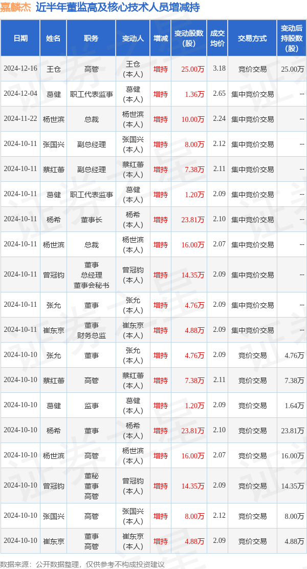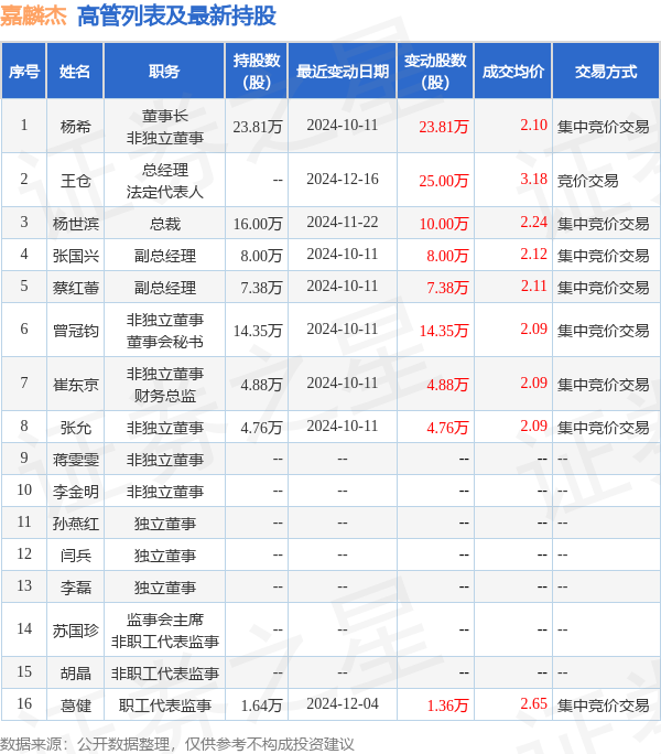 嘉麟杰的高管列表及最新持股情况如下: