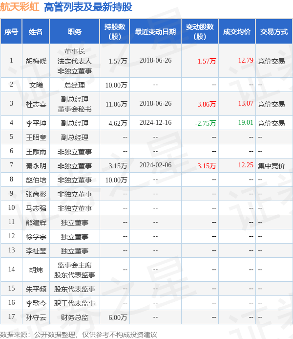航天彩虹近半年内的董监高及核心技术人员增减持详情如下: