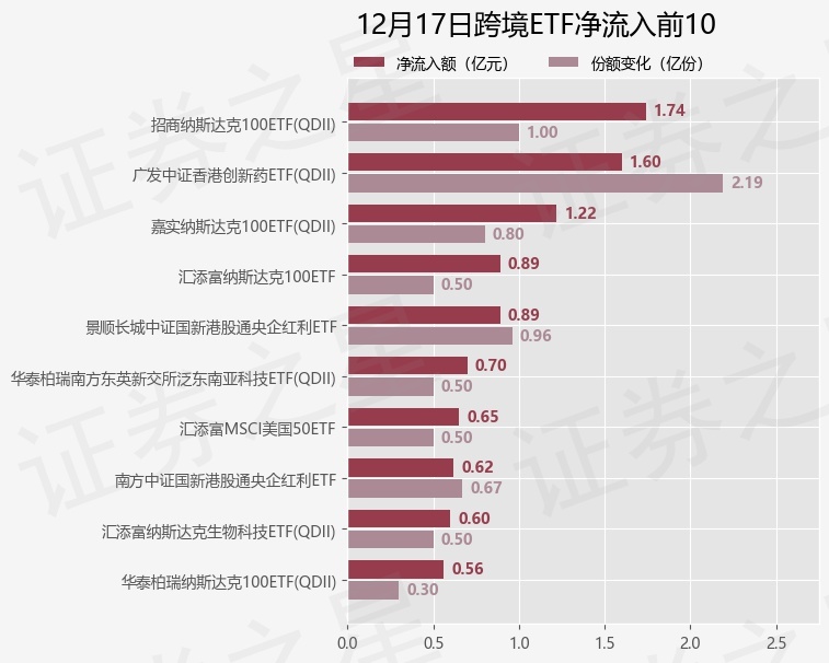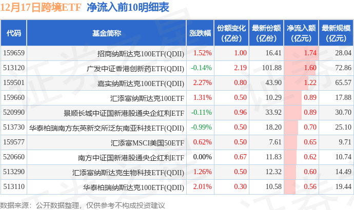 当日有68只跨境ETF基金出现资金净流入,其中净流入排首位的是招商纳斯达克100ETF(QDII)(159659),份额增加了1.0亿份,净流入额为1.74亿元。