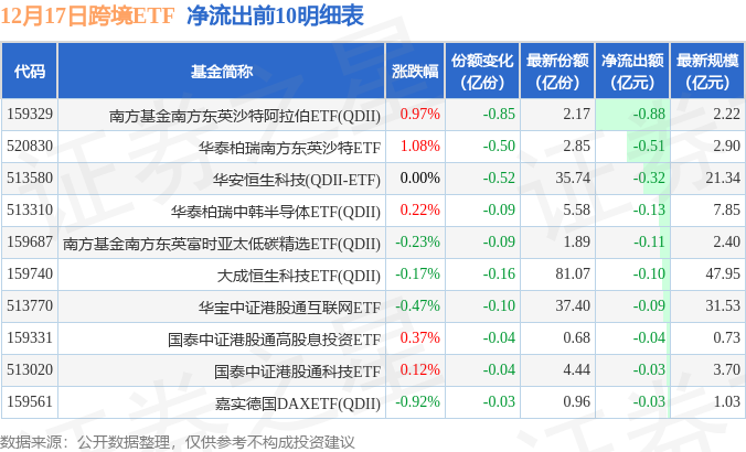当日有17只跨境ETF基金出现资金净流出,其中净流出排首位的是南方基金南方东英沙特阿拉伯ETF(QDII)(159329),份额减少了8500.0万份,净流出额为8784.97万元。